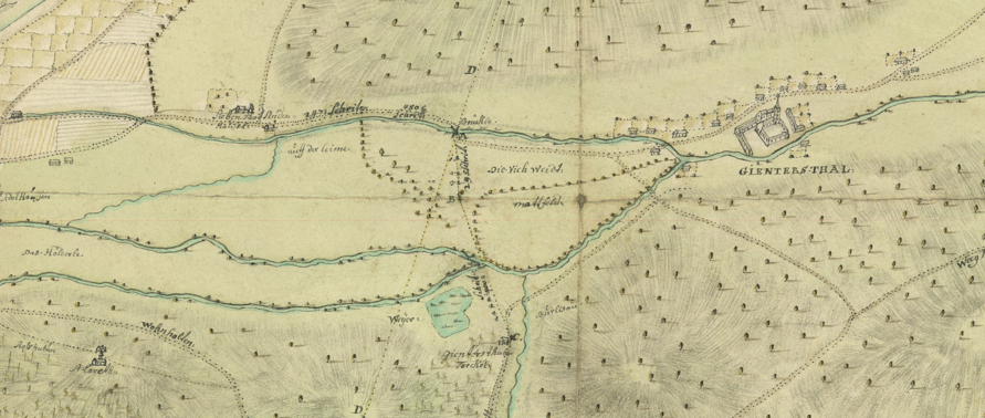 Hier sieht man die Situation auf dem Gemarkungsplan der Stadt Freiburg, der deutlich später (1698) veröffentlicht wurde: Der Bohrerbach teilte sich von Freiburg kommend am Eingang des Klostergeländes in zwei Arme auf und hatte eine Parallelführung im Silberbach.